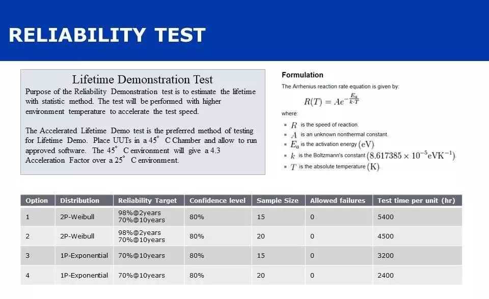 所以,这样的试验安排比较适合于测试计划可以独立于产品项目开发周期的情况。反过来说,通常情况下,在产品开发的不同阶段,可靠性试验的设计都必须满足项目的时间表。因为在每个Milestone Review时,可靠性部门需要给出产品定量或定性的可靠性评估数据。通常做法是 Test to pass 的试验安排。那么,在设计可靠性测试方案时,就需要考虑可靠性的指标是多少,需要多少的测试样品,需要多久的测试时间?这往往是大家比较头疼的事。