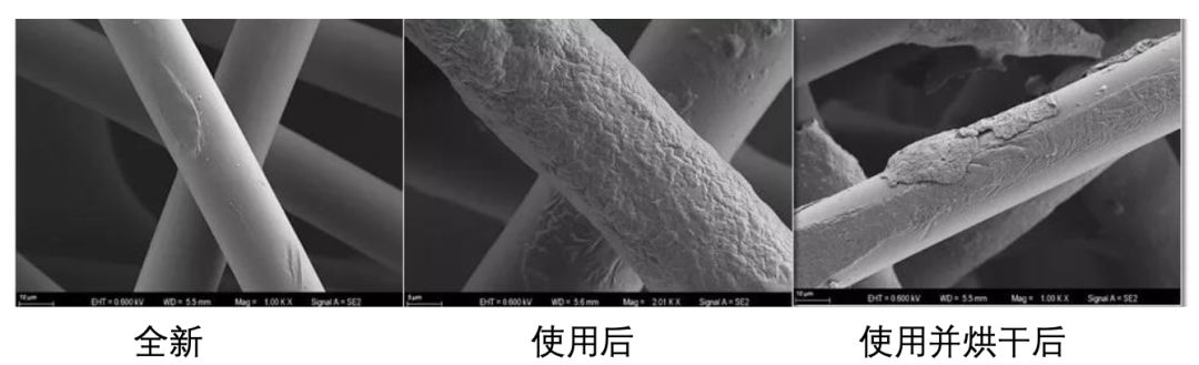 使用并烘干后的KN95口罩纤维结构相比新口罩没有明显改变